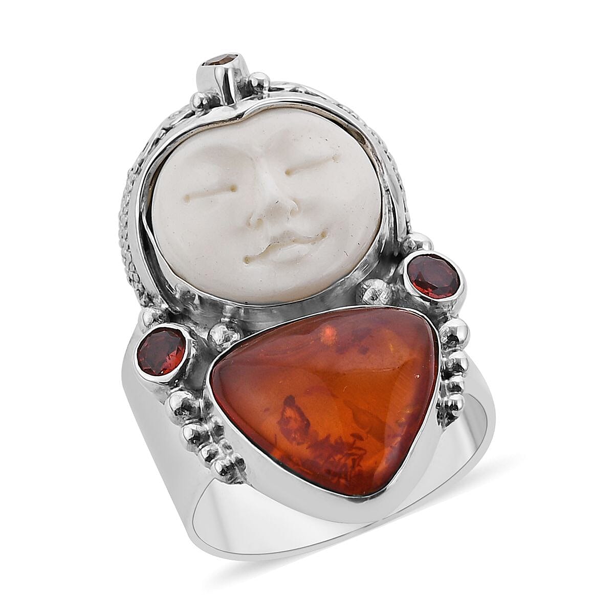 Sajen Silver Carved Bone, Baltic Amber and Multi Gemstone Ring in Sterling Silver (Size 6.0) 0.80 ctw