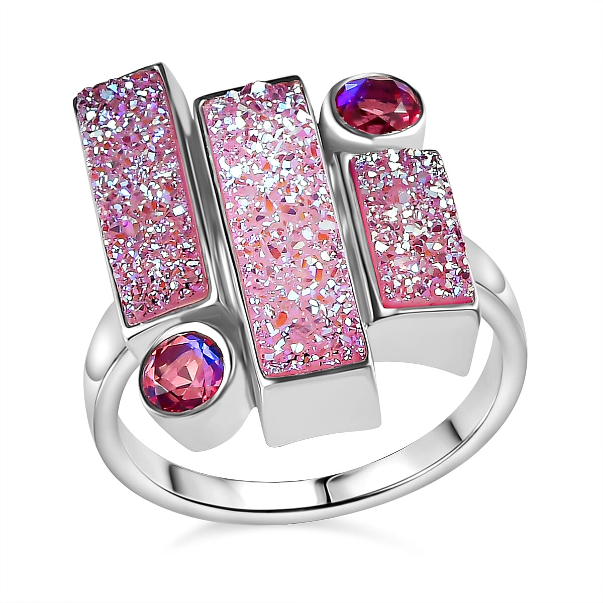 Sajen Silver Golden Dream Pink Flat Drusy Quartz and Pink Rainbow Doublet Quartz 5.75 ctw Ring in Rhodium Over Sterling Silver (Size 9.0)