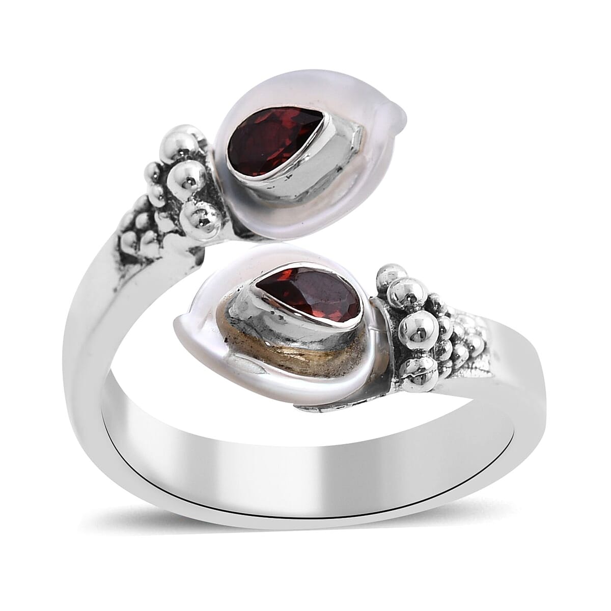 Sajen Silver Mother Of Pearl Carved Flower and Mozambique Garnet Bypass Ring in Sterling Silver (Size 10.0) 0.50 ctw