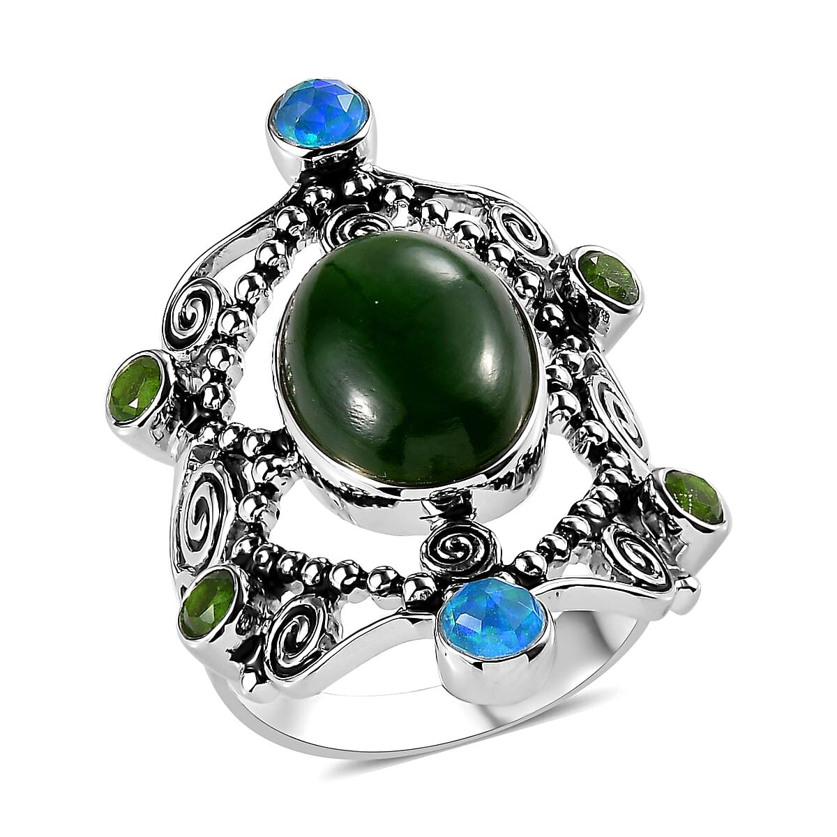 Sajen Silver Nephrite Jade and Multi Gemstone 8.35 ctw Ring in Rhodium Over Sterling Silver (Size 7.0)