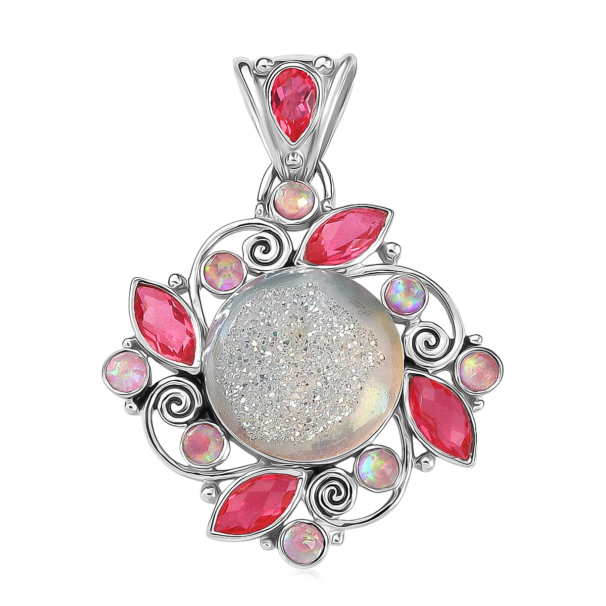Sajen Silver Pink Pearl Dyed Window Drusy Quartz, Multi Gemstone Pendant without Chain in Rhodium Over Sterling Silver 16.40 ctw