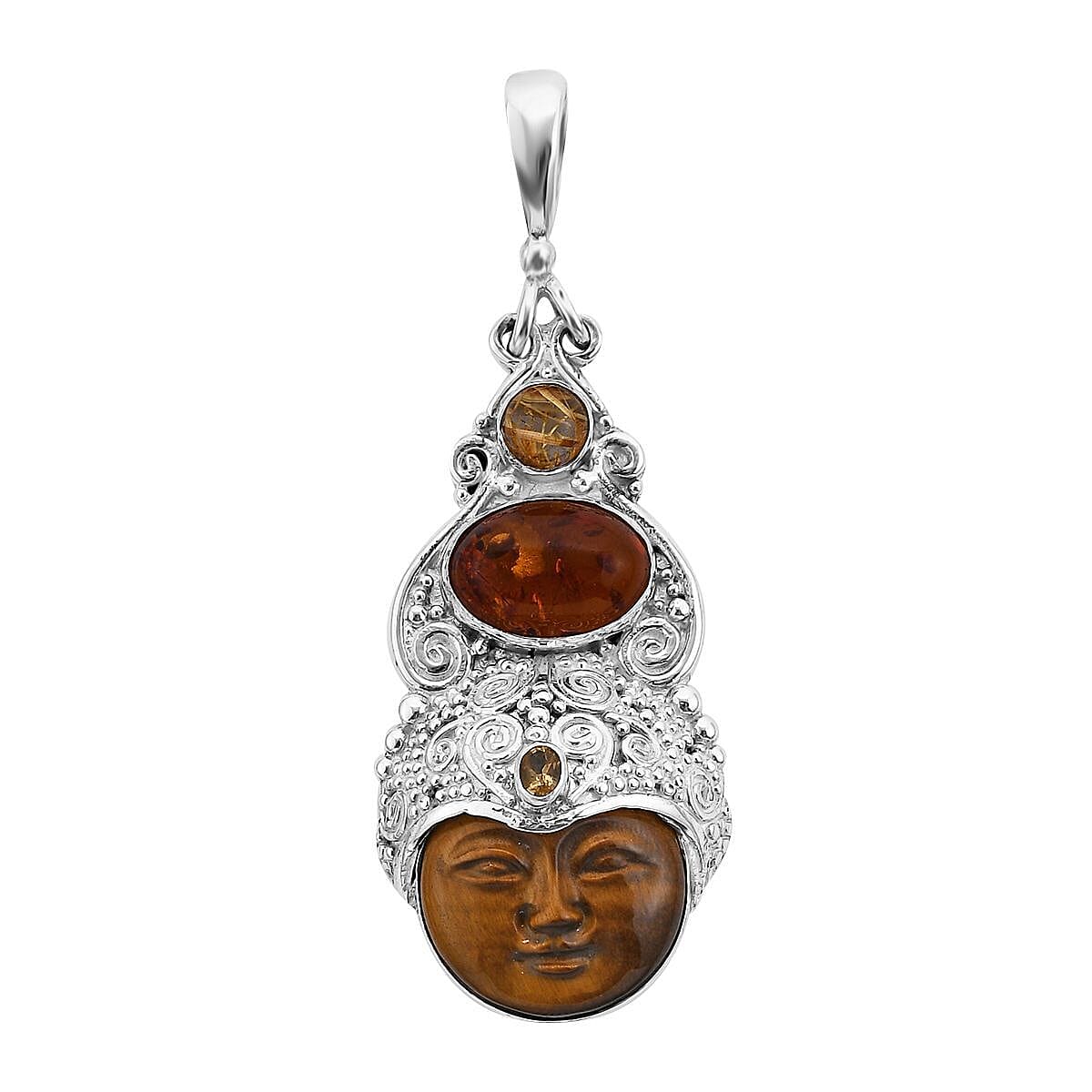Sajen Silver Tigers Eye Carved and Multi Gemstone Pendant in Sterling Silver 12.70 ctw