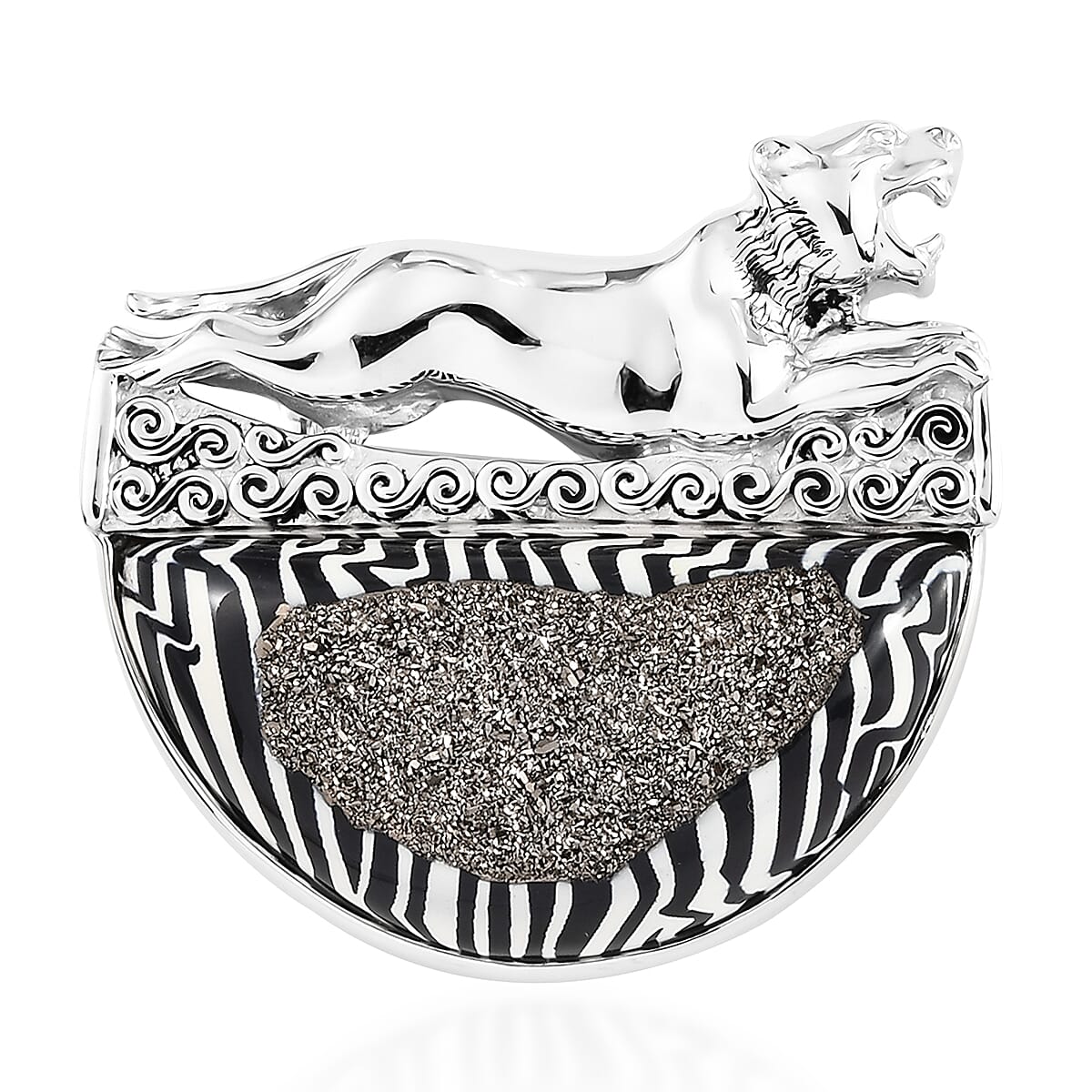 This window drusy astral zebra black diamond pendant amazes with its sparkling beauty! With zebra lines as the base, the pendant features exquisitely shining black diamond embellishment and an intricate metalwork frame. Additionally, this pendant is drenched in platinum-plated sterling silver. Smooth under the gallery makes this Sajen Silver pendant comfortable to wear.
