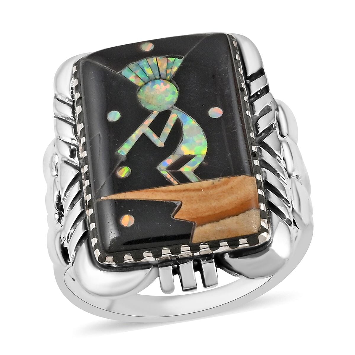 Santa Fe Style Black Onyx and Lab Created Opal Kokopelli Ring in Sterling Silver (Size 10.0) 5.25 ctw