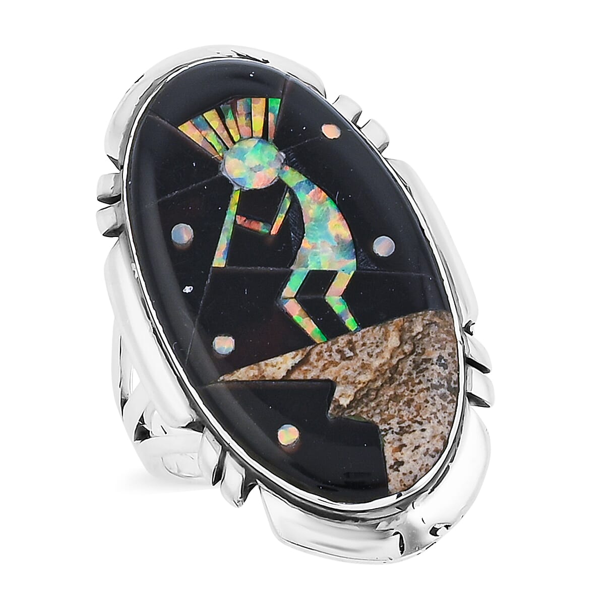 Santa Fe Style Black Onyx and Multi Gemstone 12.50 ctw Kokopelli Ring in Sterling Silver (Size 11.0)