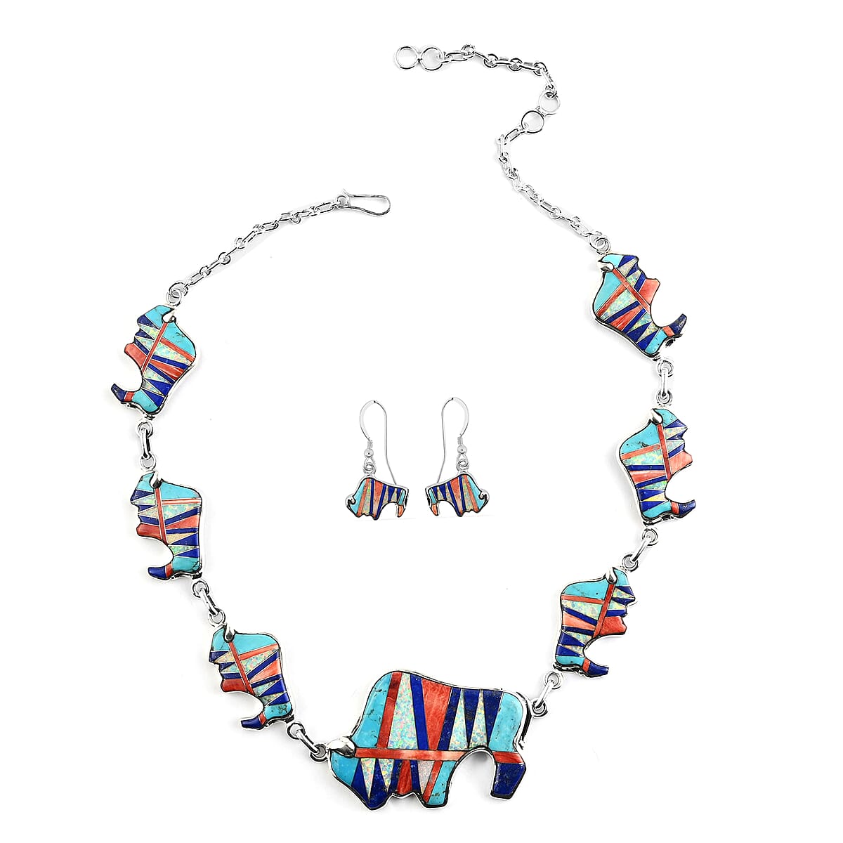 SANTA FE Style Black Onyx, Lab Created Opal Buffalo Dangle Earrings and Necklace 20 Inches in Sterling Silver 83.60 Grams 3.55 ctw
