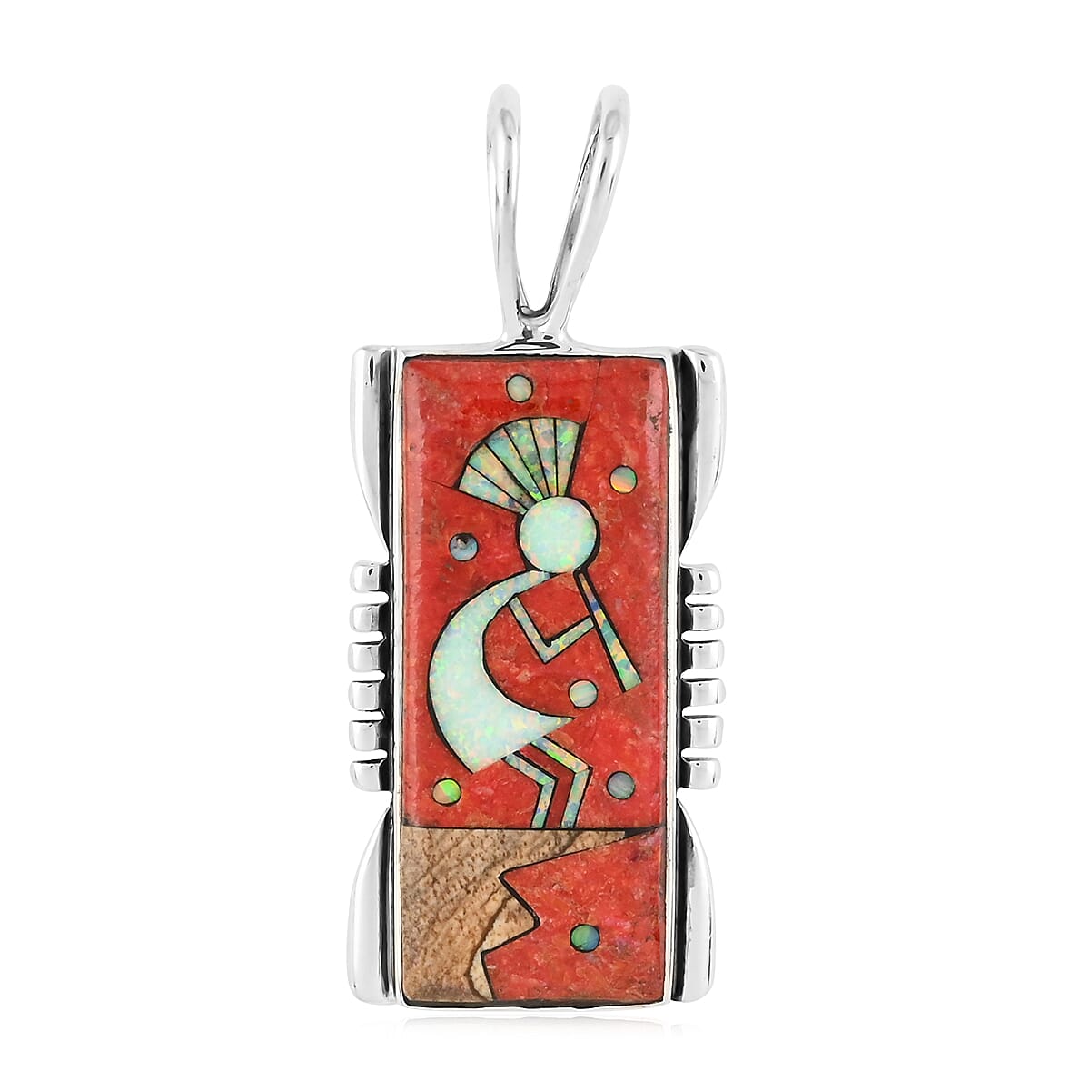 Santa Fe Style Enhanced Coral and Multi Gemstone Kokopelli Pendant in Sterling Silver 0.25 ctw