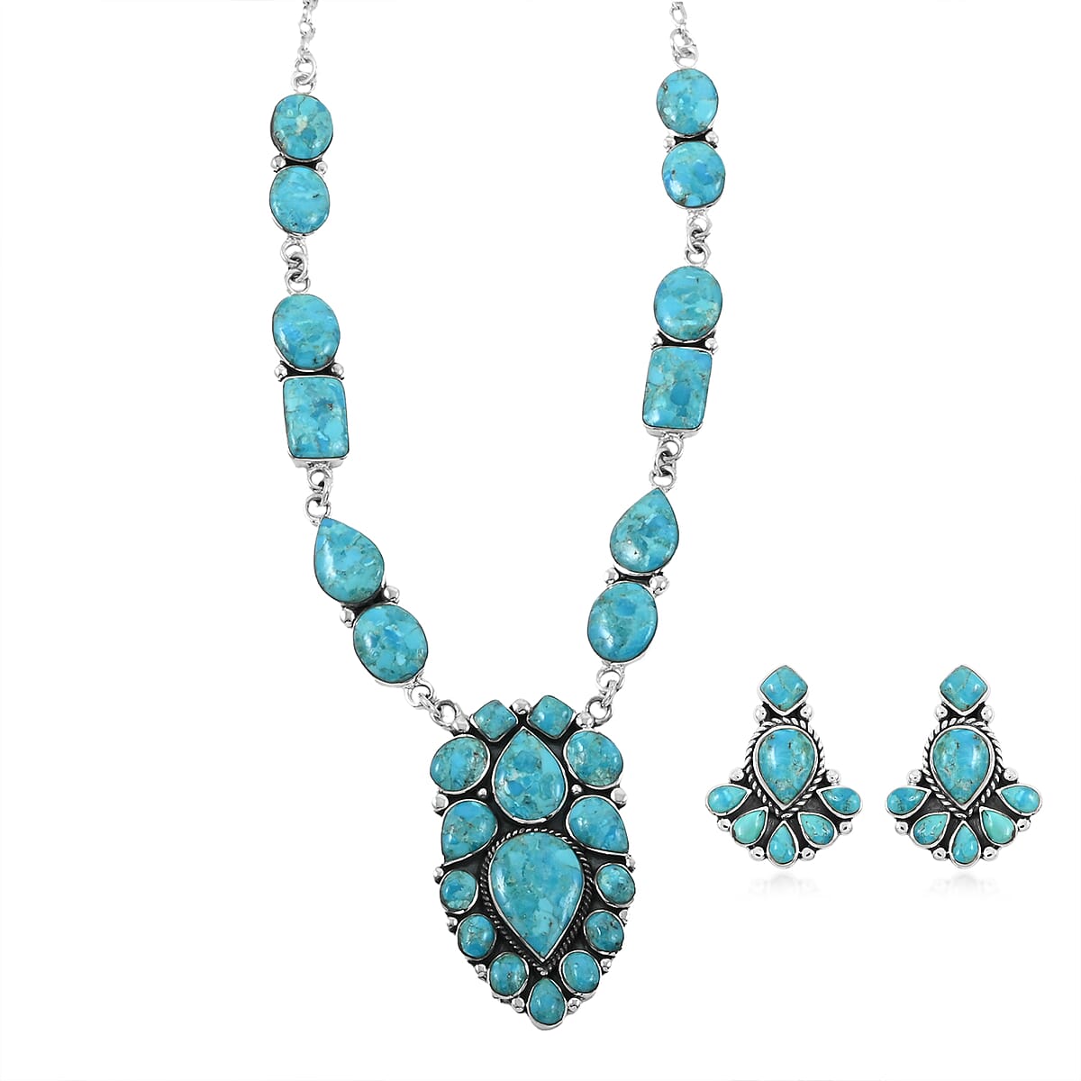 Santa Fe Style Kingman Turquoise 122.00 ctw Necklace 18 Inches and Earrings in Sterling Silver