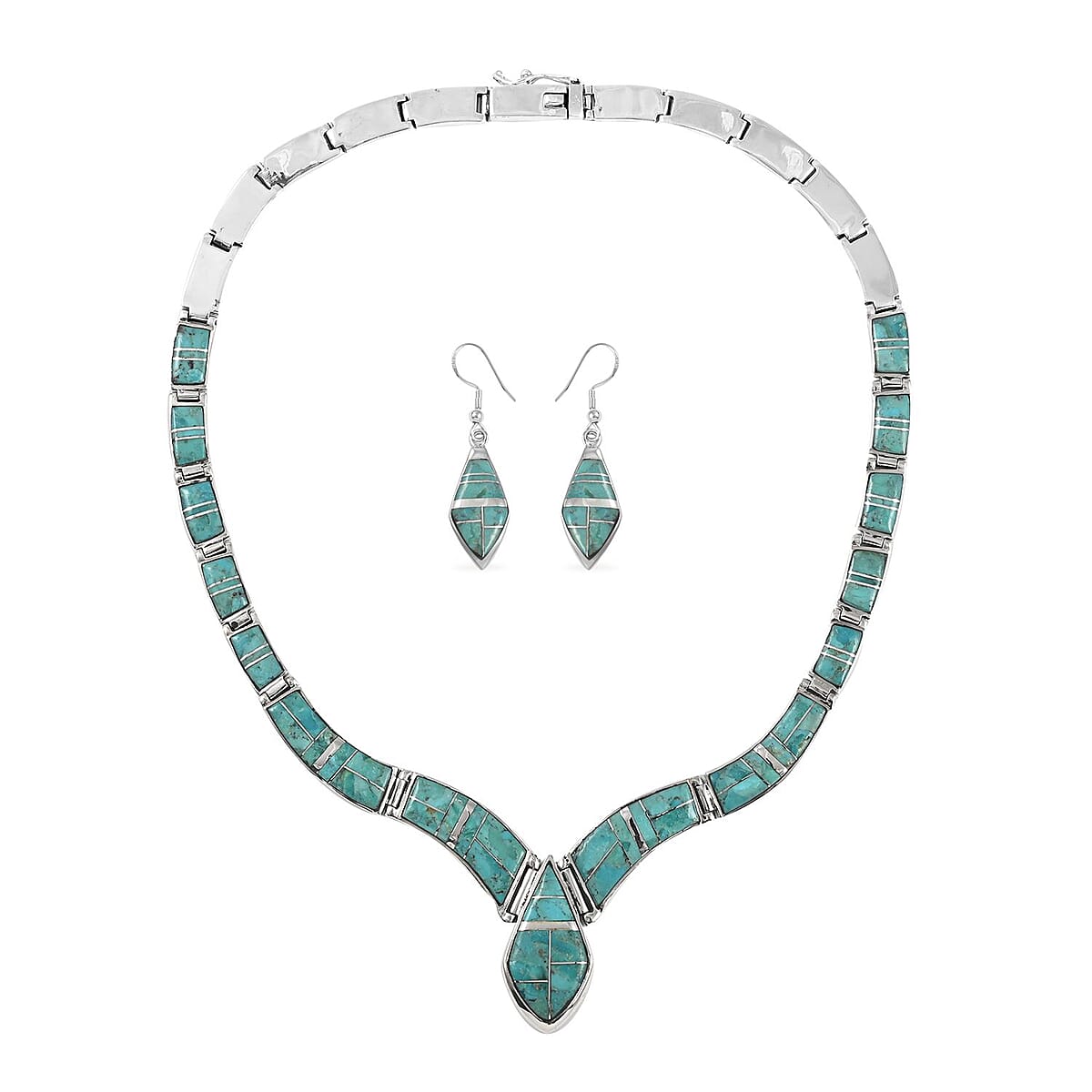 Inspired by the petroglyphs of running water used by Native Americans as a representation of their culture and society, this jewelry set symbolizes constant life. The gemstones are set beautifully in a bezel and joined with each other through metal links. The spearhead design of the metal with gemstones embraces the center of the necklace and forms the design of the earrings. Crafted in pure sterling silver, this jewelry set comprises a statement necklace with a length of sixteen inches and dangle earrings. Santa Fe Style creations are known to depict the culture and society of Native Americans well personified in contemporary fashion to show respect to the early descendants.