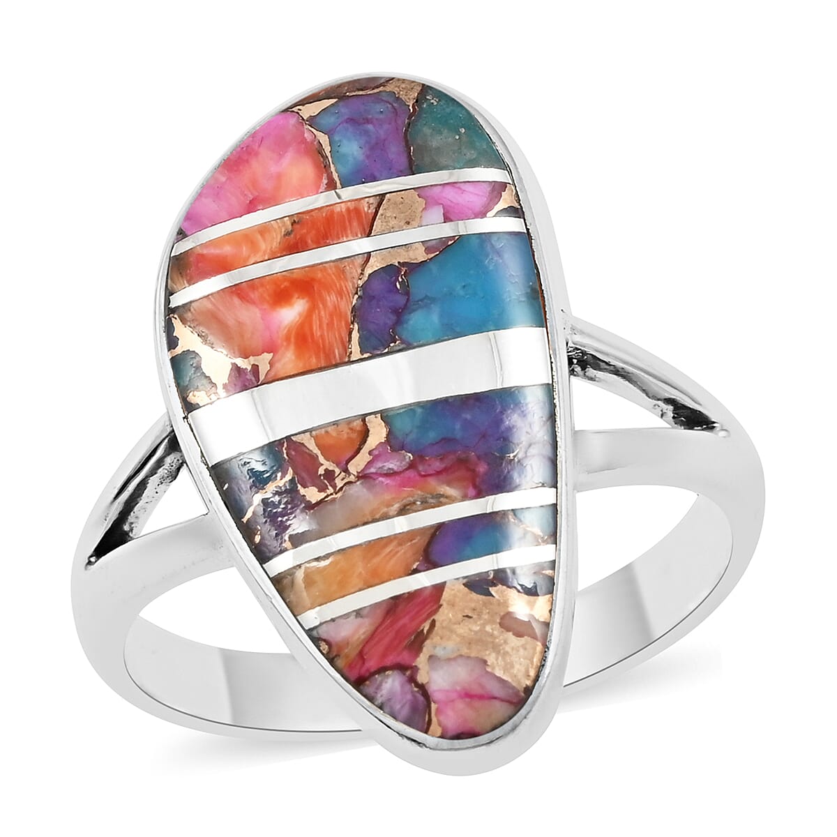 The simple yet attractive gemstone free-shaped ring showcases exquisite lines of genuine gemstones. The vibrant-toned gemstone slabs are bezel set closely in the free-shape frame. The split shank adds exceptional allure to the ring design. Fashioned in a sterling silver frame, it looks marvelous in every attire. Its free-shape cut gives it a unique appeal; make sure you collect this one. SANTA FE Style's jewelry style reflects the artistry of villages from the American Southwest that depicts flavorful styles and lively colors.
