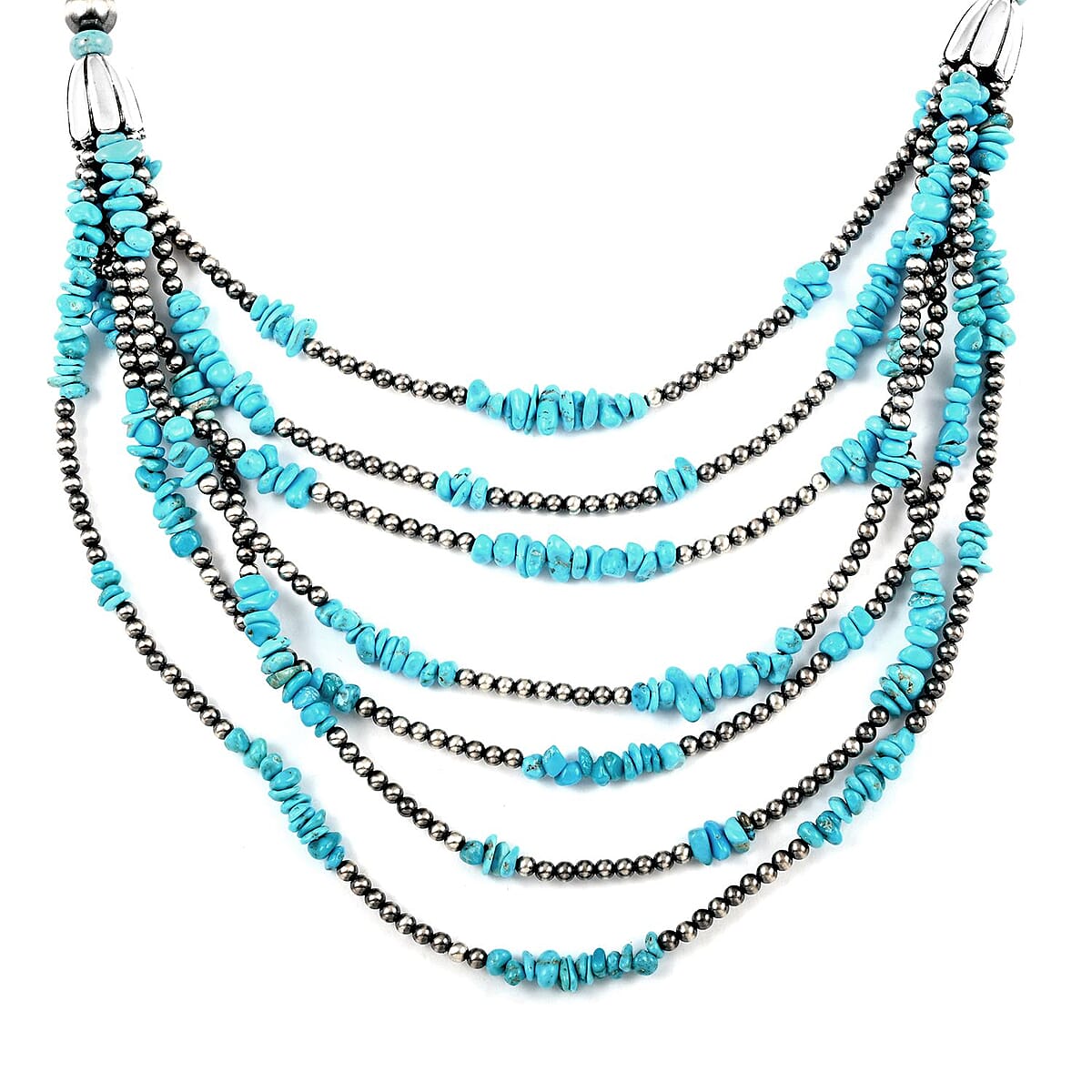 In the soul of the Southwest and crafted with meticulous attention to detail, this Santa Fe Style Kingman turquoise necklace embodies jovial elegance. Designed for the playful and spontaneous at heart, the quirky charm of this multi-strand beads necklace radiates a distinctive energy that's engaging and irresistibly witty.