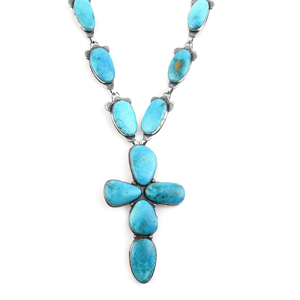 Santa Fe Style Mojave Turquoise Statement Cross Necklace 34 Inches in Sterling Silver (Made in USA) 1525.00 ctw