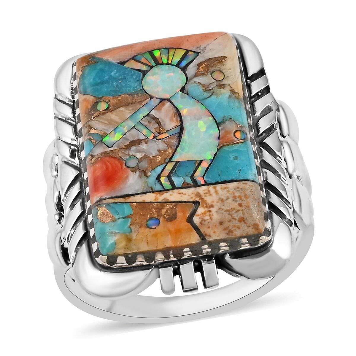 Santa Fe Style Multi Color Spiny Turquoise and Lab Created Opal Kokopelli Ring in Sterling Silver (Size 11.0) 5.25 ctw