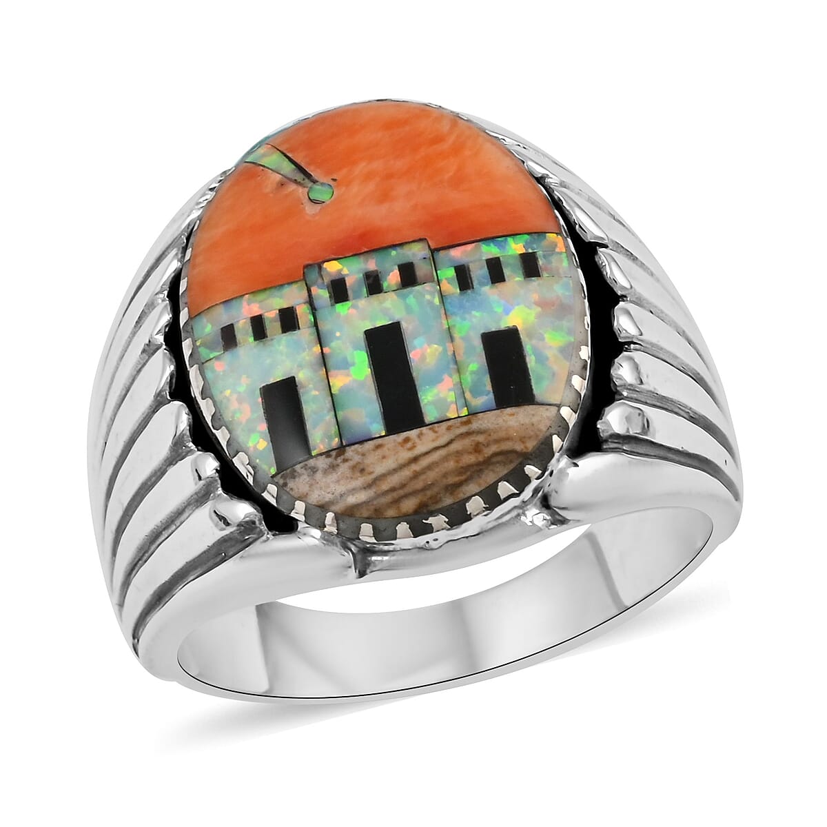 Santa Fe Style Orange Spiny Oyster Shell and Lab Created Opal Men's Ring in Sterling Silver (Size 12.0)