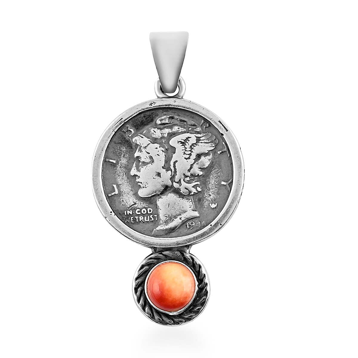 Santa Fe Style Orange Spiny Oyster Shell Hermes Coin Pendant in Sterling Silver (5.2 g)