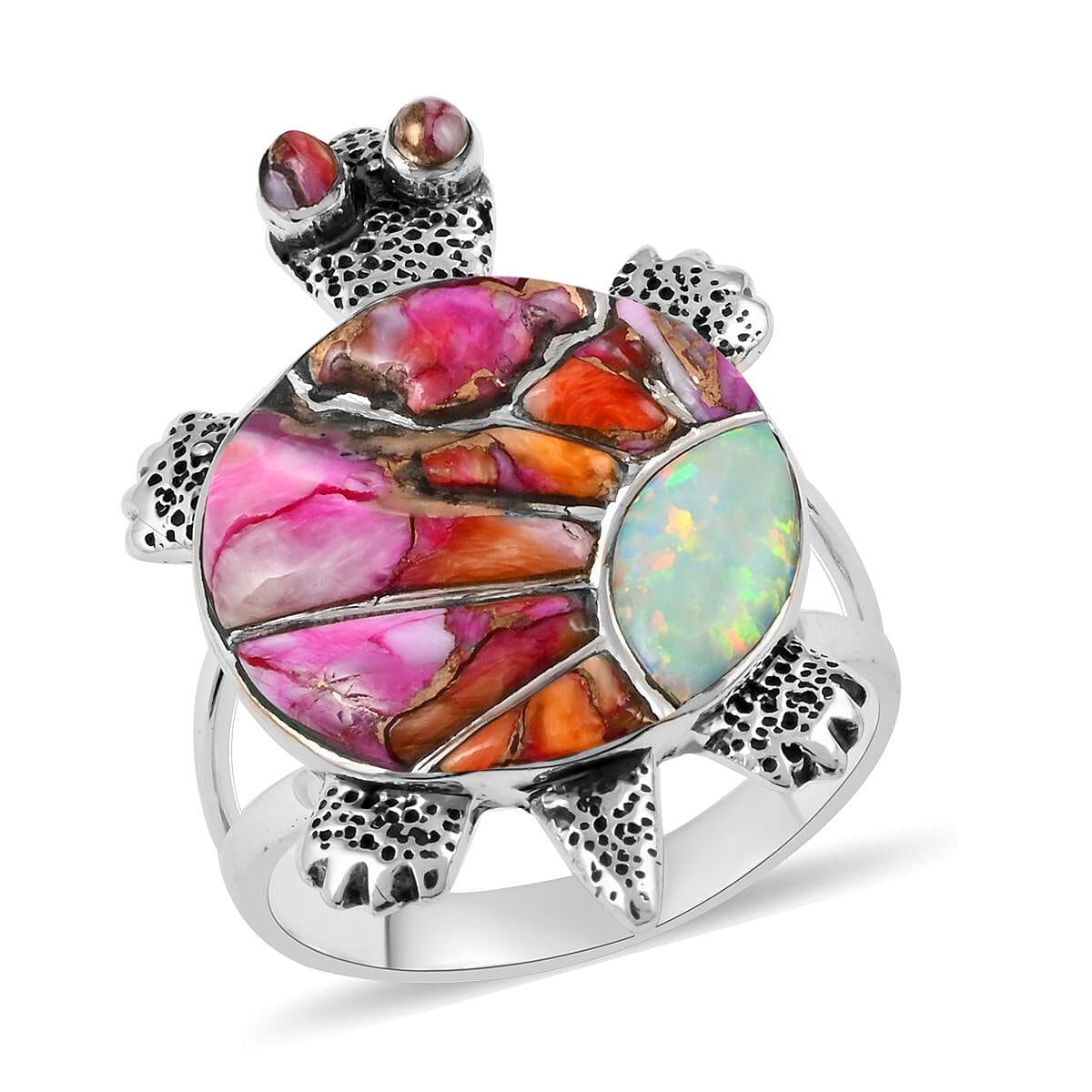 Unleash your inner mischief with the Santa Fe style genuine gemstone turtle ring in sterling silver. As playful as a turtle's wink, this ring bursts with a bold homage to resilience, endurance, and sly wisdom. Genuine gemstones adorn the shell in a whimsical pattern, partnered with lab-created opal for an extra dash of magic. The silky metal work finesses the ring's vintage appeal, skillfully shaped from sterling silver of the finest quality.