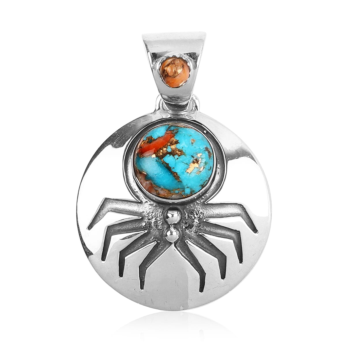 A spider embossed metallic pendant adorned with Royston Turquoise and Green Kiwi Jasper looks stunning. Spider meaning and symbolism include artistry, manifestation, patience, feminine power, ancient wisdom, illusion, balance and interconnection. Turquoise set as spider body and jasper set on bail makes this pendant remarkable. The cherry on the cake is the smooth and lustrous platinum-plated sterling silver.