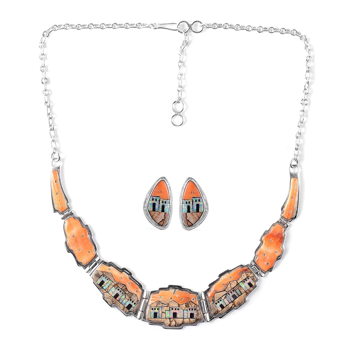 Santa Fe Style Spiny Oyster Shell, Multi Gemstone Earrings and Necklace (16-18 in) in Sterling Silver (36 g) 3.35 ctw