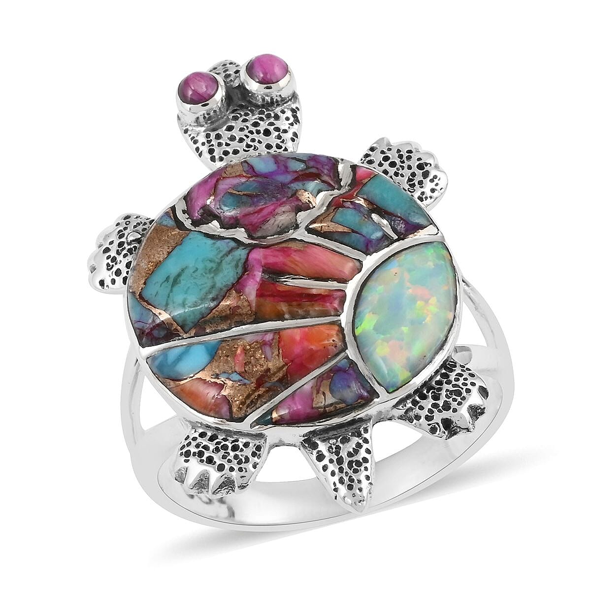 Unleash your inner mischief with the Santa Fe style genuine gemstone turtle ring in sterling silver. As playful as a turtle's wink, this ring bursts with a bold homage to resilience, endurance, and sly wisdom. Genuine gemstones adorn the shell in a whimsical pattern, partnered with lab-created opal for an extra dash of magic. The silky metal work finesses the ring's vintage appeal, skillfully shaped from sterling silver of the finest quality.