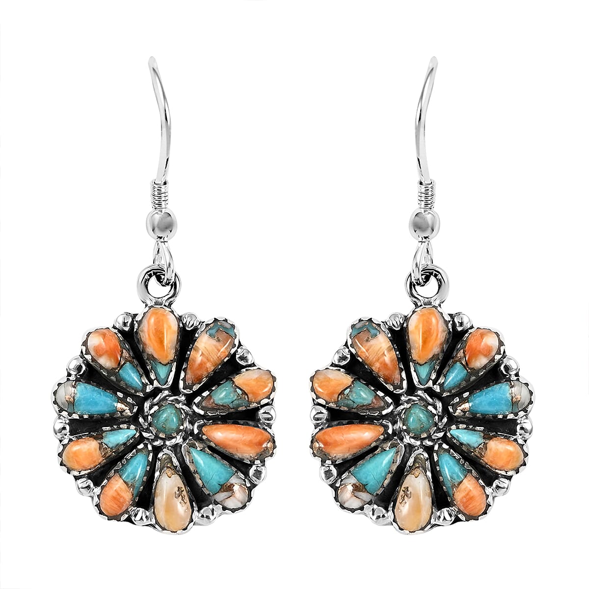 Santa Fe Style Spiny Turquoise Flower Dangle Earrings in Sterling Silver 2.75 ctw