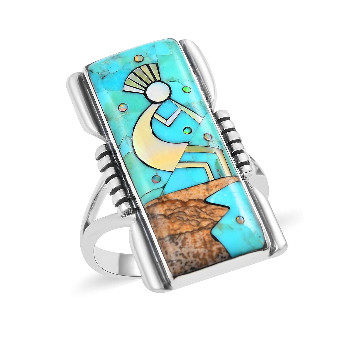 Santa Fe Style Turquoise and Multi Gemstone 8.00 ctw Kokopelli Ring in Sterling Silver (Size 9.0)