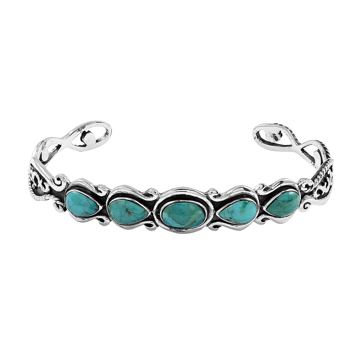 Add a distinct appeal to your collection with this Santa Fe style cuff bracelet. Cultured in the designer frame of sterling silver, the cuff is laced with oval and pear shaped gemstones. The lovely cuff is graced with amazing metalwork, enhancing its appearance. Wear the fashionable accessory for any formal or casual outing and flaunt your distinct jewelry collection.