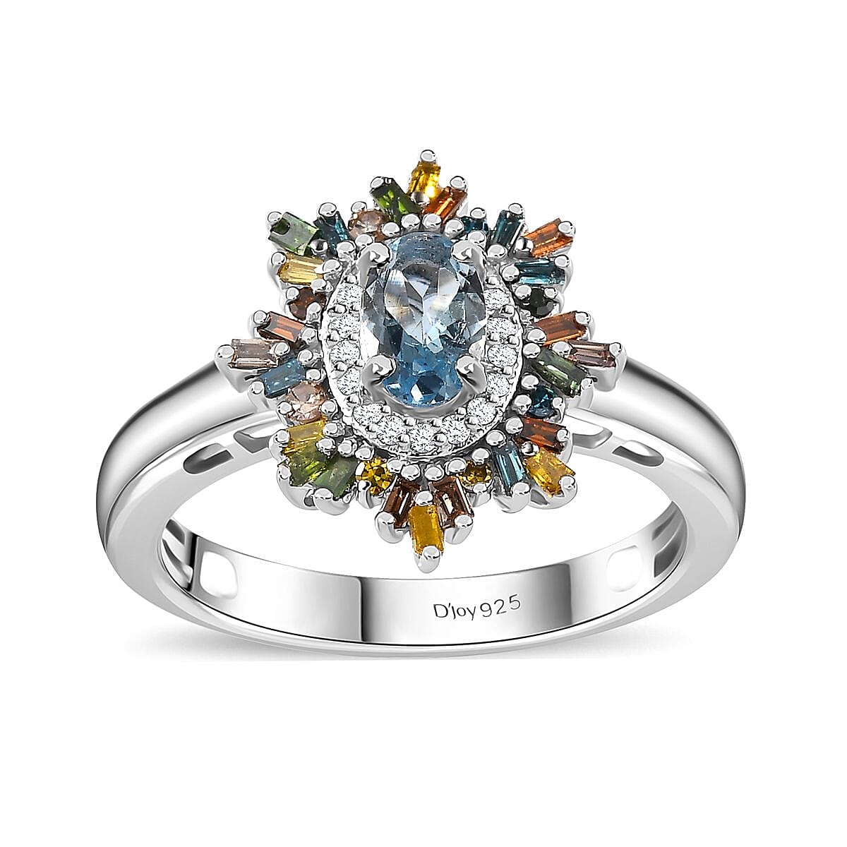 Santa Maria Aquamarine and Multi Diamond Sunburst Ring in Platinum Over Sterling Silver (Size 8.0) 0.75 ctw