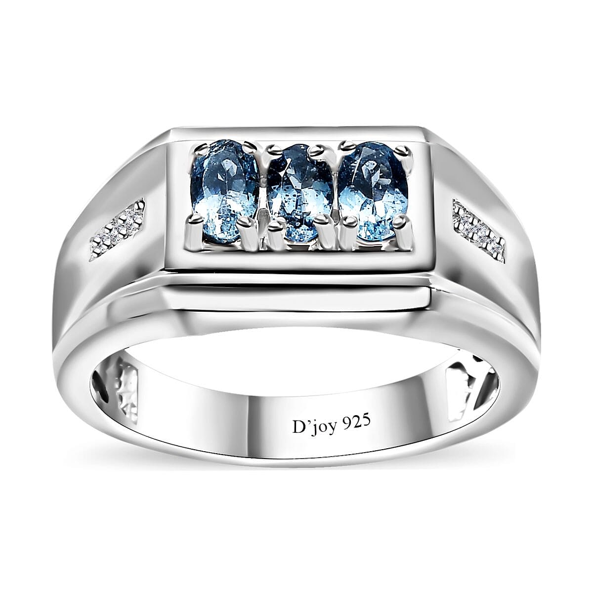 This aquamarine trilogy men's ring features three oval-shaped aquamarines in the center, accented by white zircons on the shank, set in platinum over sterling silver. The aquamarines are prong-set for security and visibility. Aquamarines are known for their serene blue hue, while zircons add a sparkling touch to this aquamarine ring for men.