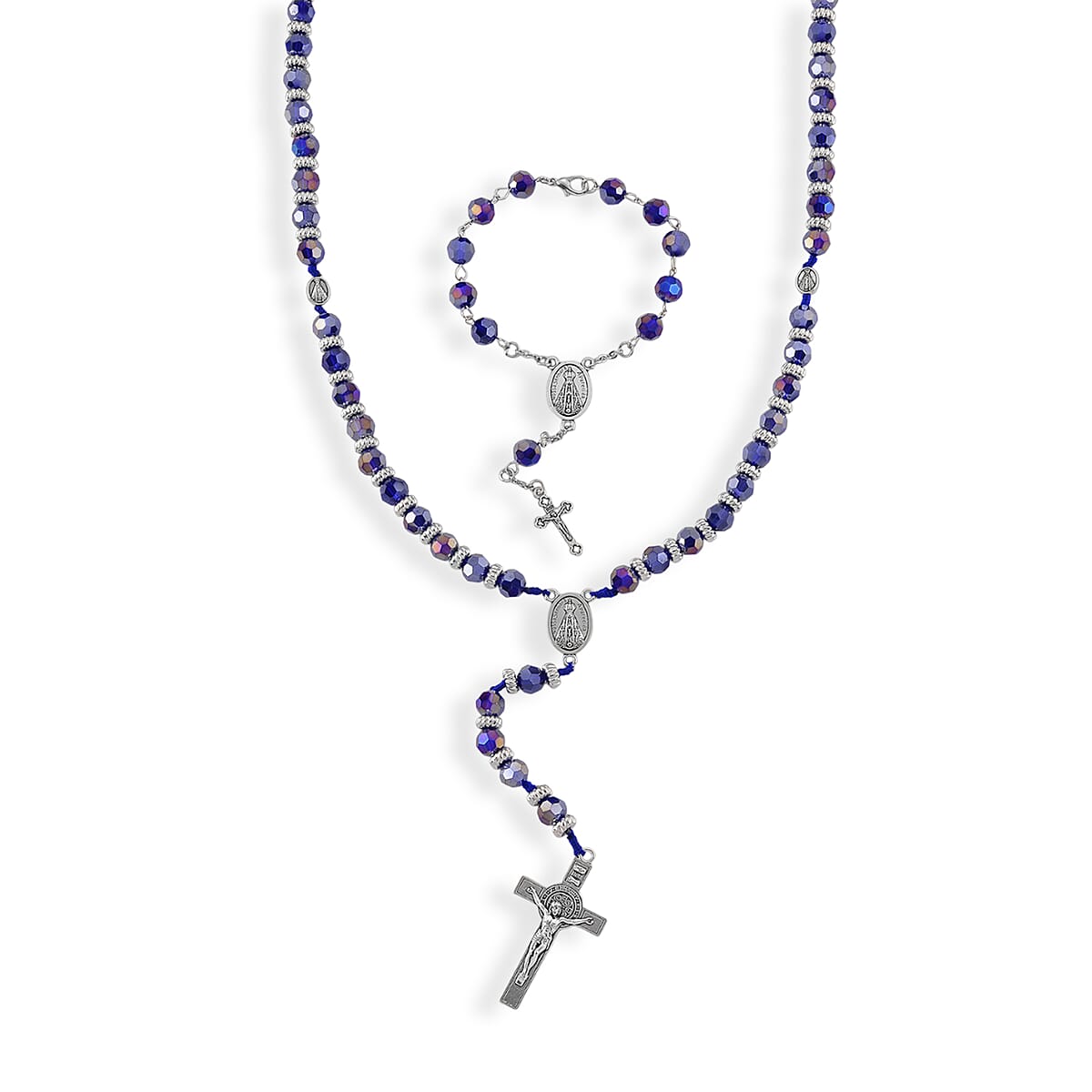 Sapphire Blue Glass Beaded Necklace (28 Inches) and Bracelet (7.5-9.5In) in Silvertone