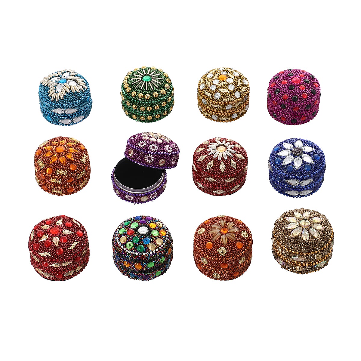 Set of 12 Multi Color Aluminum Beaded Round Ring Boxes