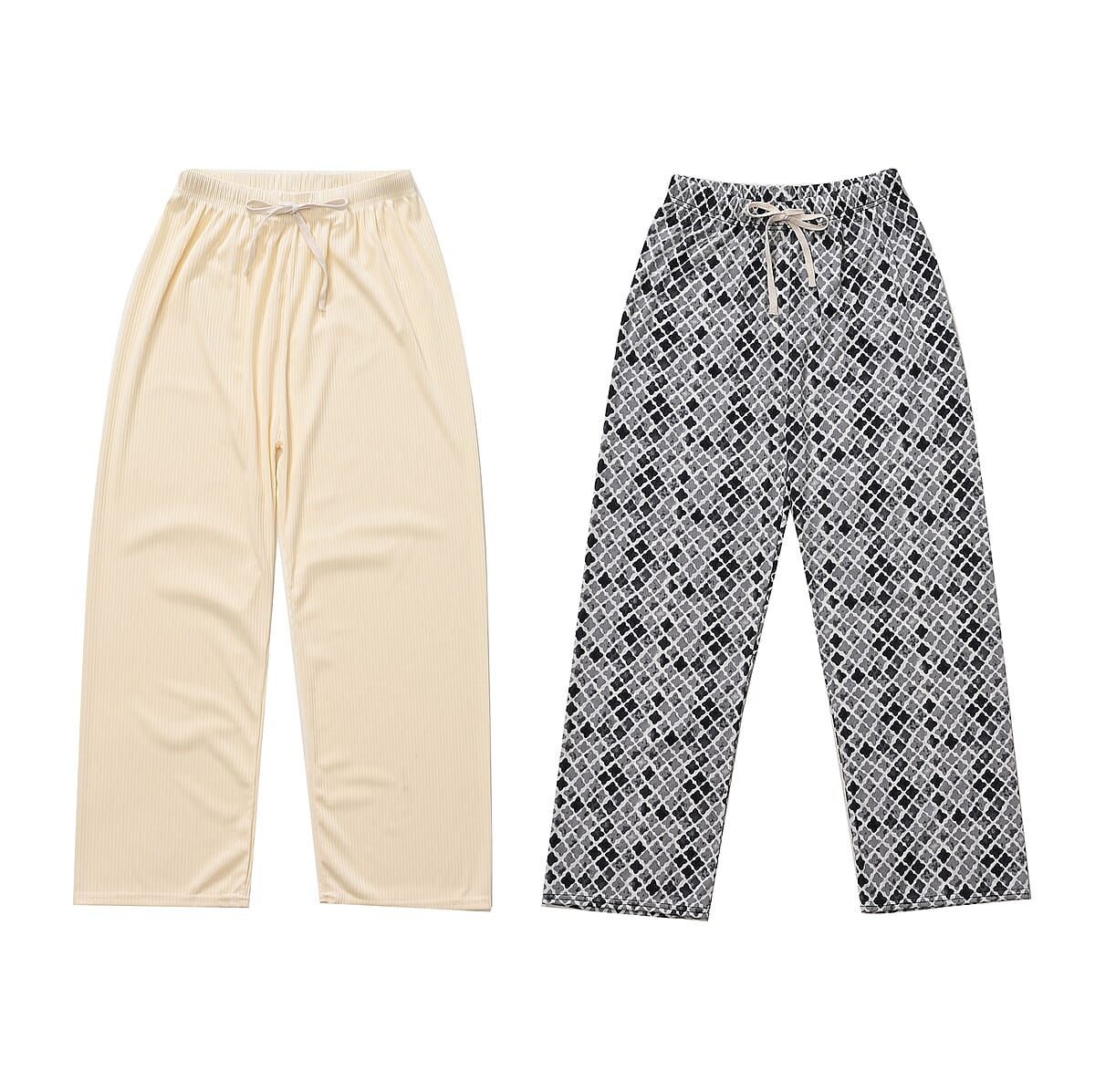 Set of 2 Beige and Geometric Rib Knit Stretch Lounge Pants - One Size Fits Most