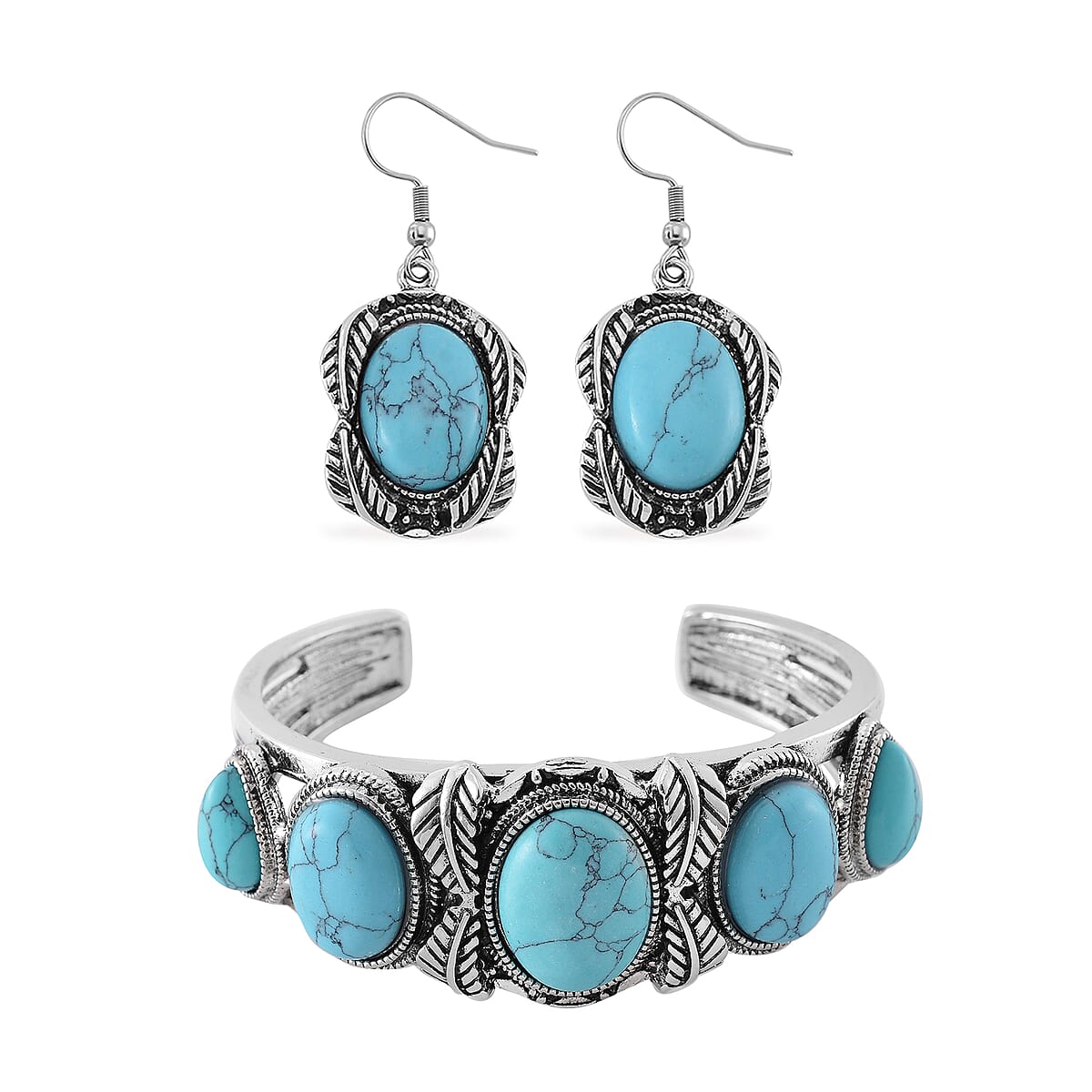 Set of 2 Constituted Blue Howlite 150.00 ctw Cuff Bracelet (7.5 In) and Earrings in Silvertone