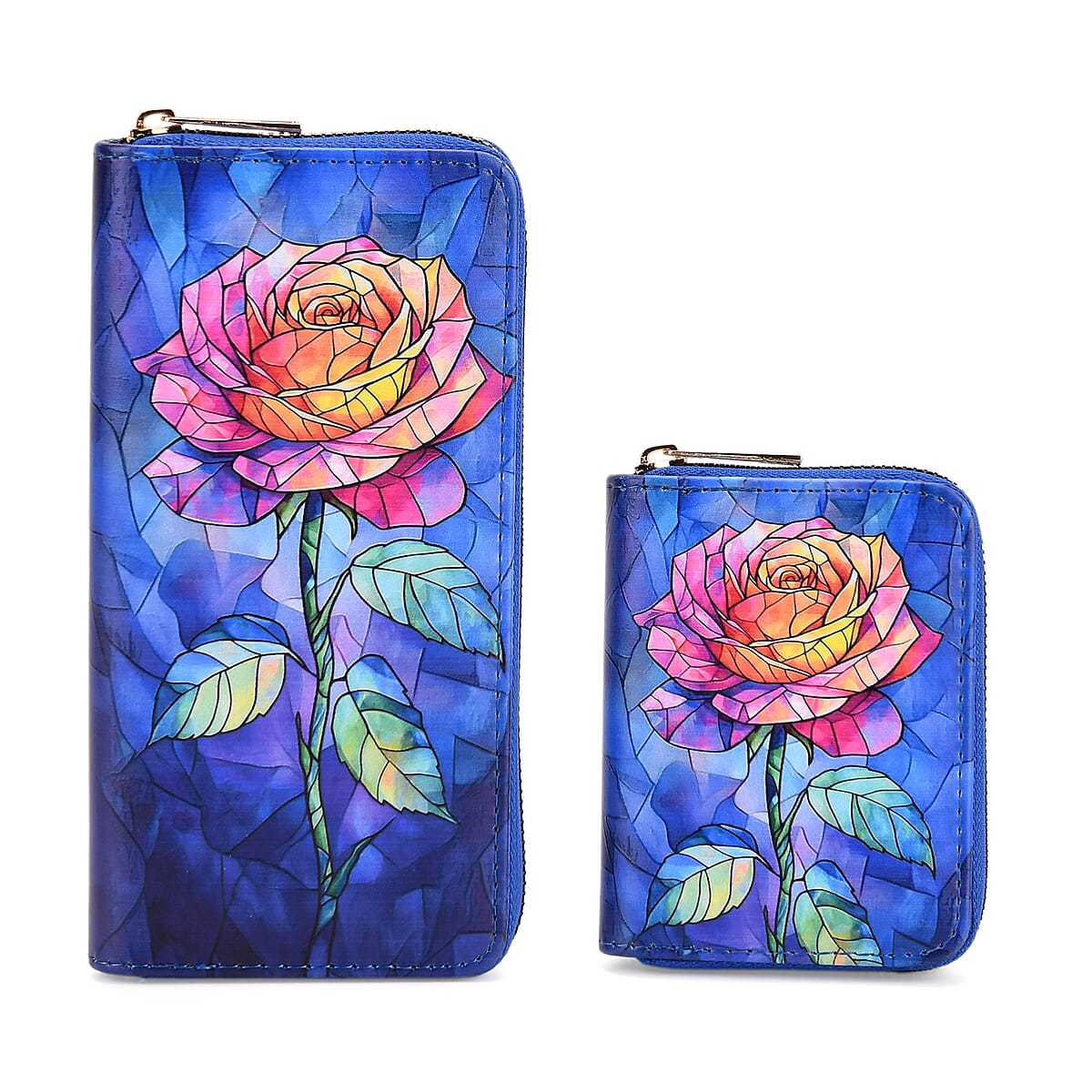 Set of 2 Dark Blue with Rose Pattern Long Wallet and Small Wallet