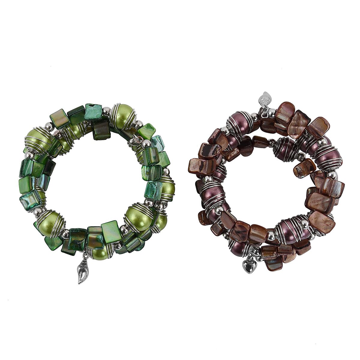 Set of 2 Green and Brown Square & Round Beaded Stretch Bracelet
