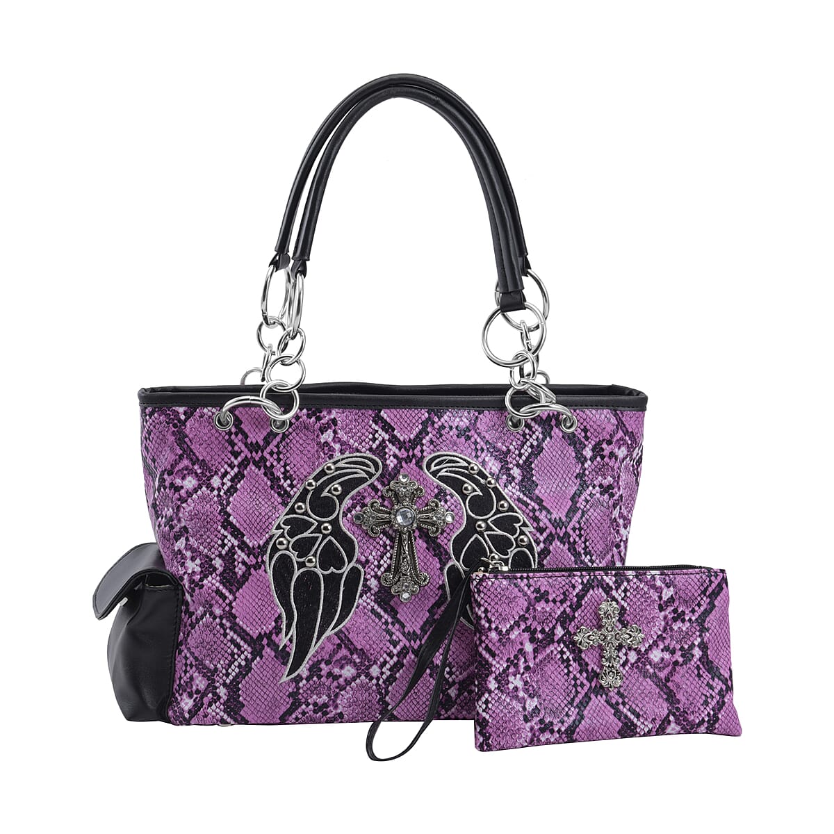 Set of 2 Purple Snake Skin Pattern Faux Leather Western Style Handbag and Clutch Bag