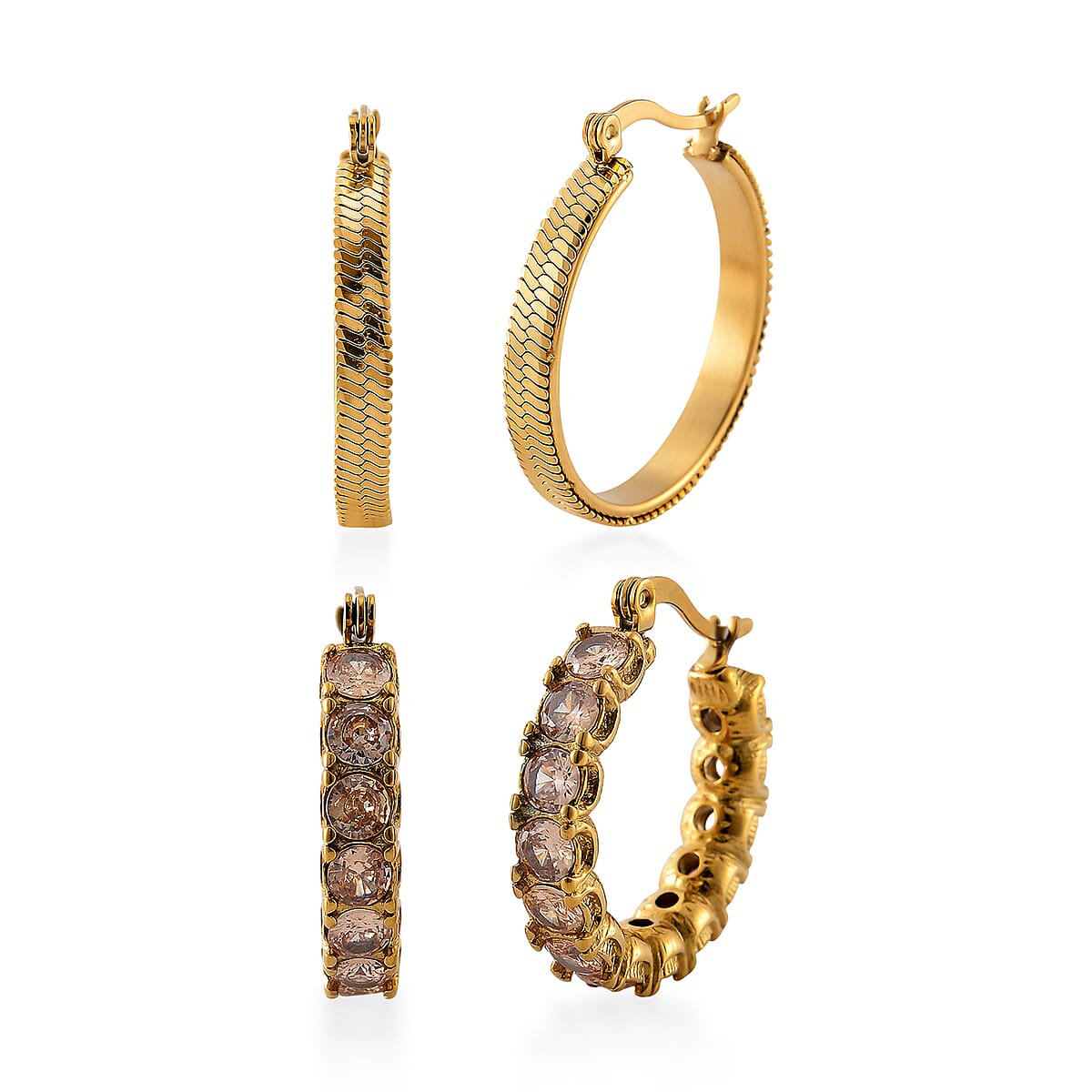 Set of 2 Simulated Champagne Diamond and Herringbone Hoop Earrings in ION Plated YG Stainless Steel