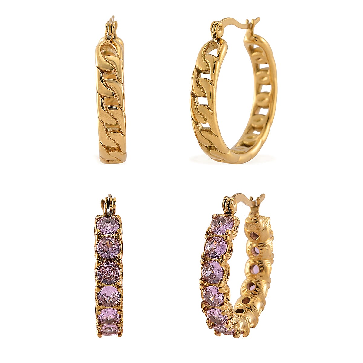 Set of 2 Simulated Pink Diamond and Curb Hoop Earrings in ION Plated YG Stainless Steel