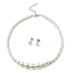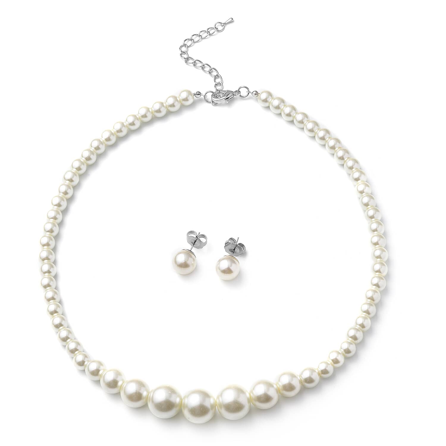 Set of 2 Simulated White Pearl Necklace 20-22 Inches and Earrings in Silvertone and Stainless Steel