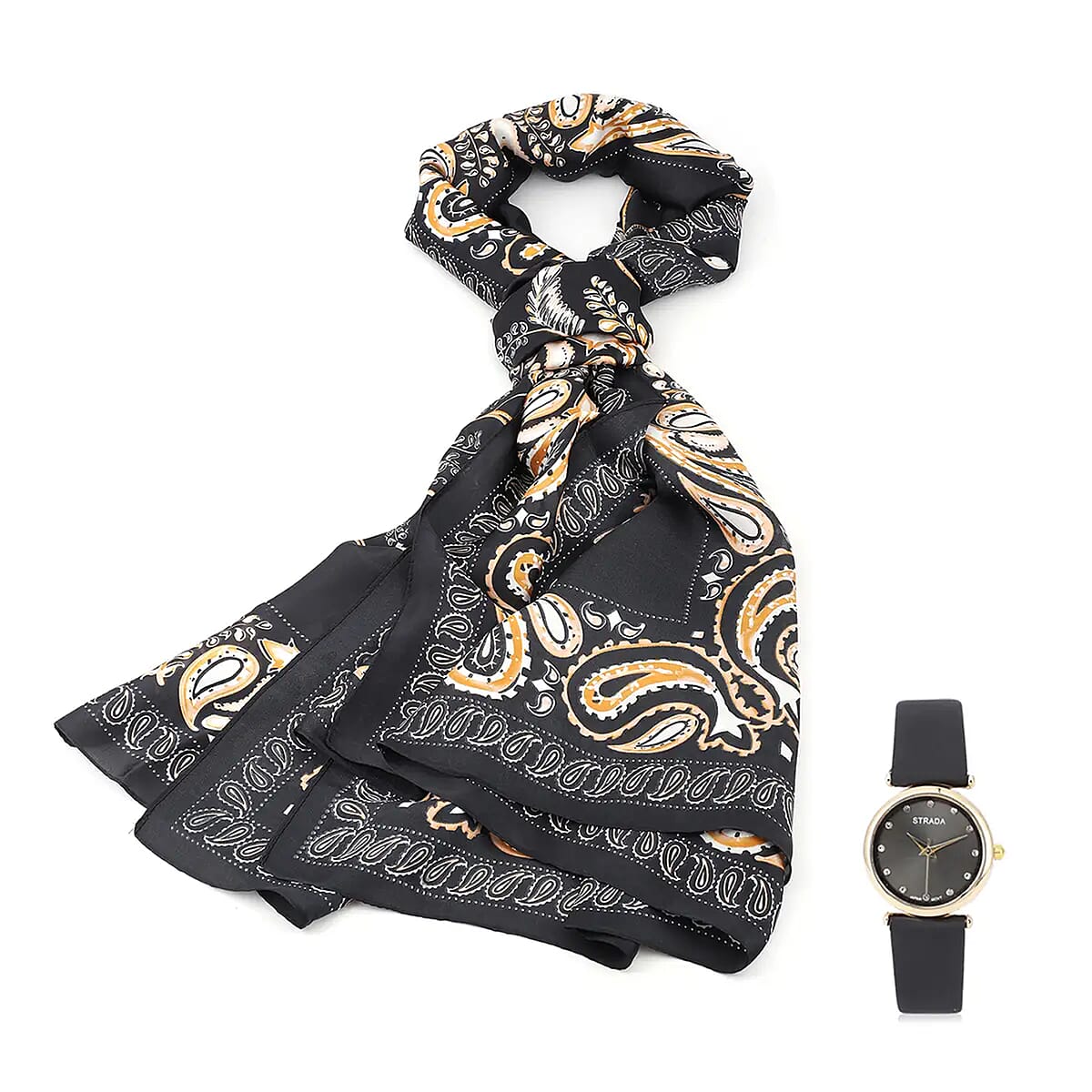 This versatile accessory set includes a Strada Japanese movement watch and a printed scarf. The watch features crystal studs, a vegan leather strap, and a buckle closure, while the scarf boasts a trendy print.
