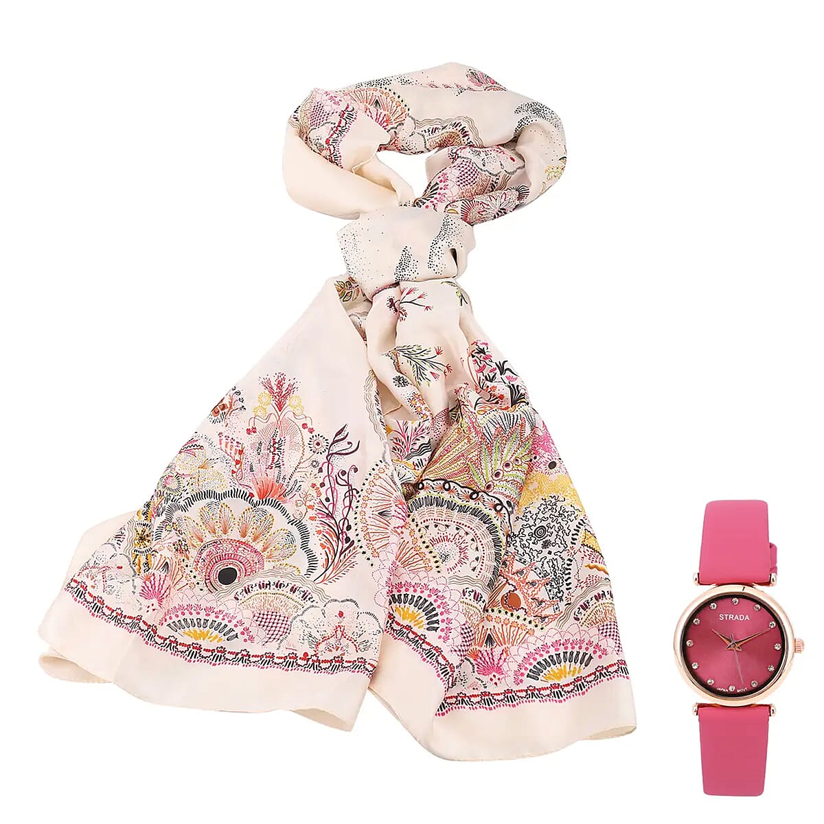 Set of 2 Strada White Crystal Japanese Movement Watch with Rose Vegan Leather Strap and Pink Print Polyester Scarf