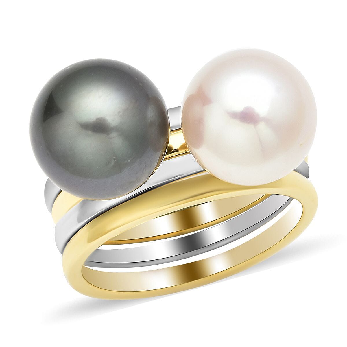 Set of 2 Tahitian Cultured Pearl and White Edison Pearl Ring in Vermeil Yellow Gold and Rhodium Over Sterling Silver (Size 9.0)