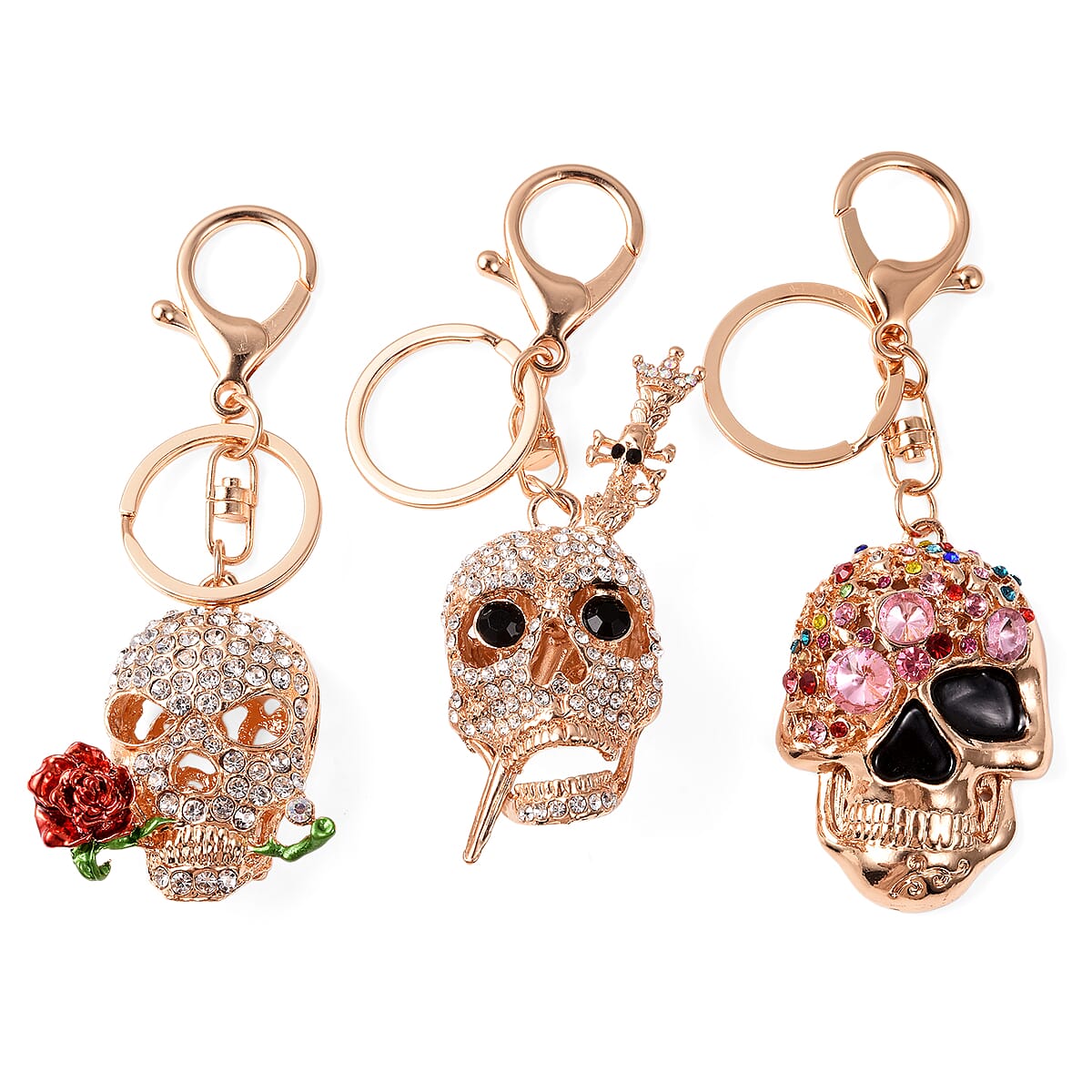 Set of 3 Austrian Crystal, Enamelled Triple Skull Design Keychains in Goldtone