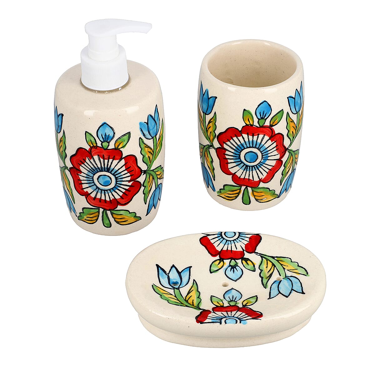 Set of 3 Ceramic Bathroom Accessory Liquid Soap Dispenser, Soap Tray & Tumbler - Multi Color