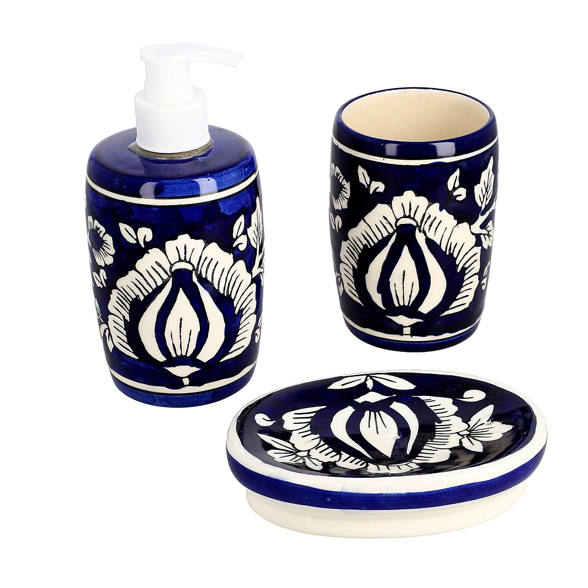 Upgrade your bathroom with our elegant set of 3 ceramic bathroom accessories – a complete bath accessory set with a liquid soap dispenser, soap tray, and tumbler. Hand-painted with an attractive pattern and water-resistant, these ceramic pieces add functionality and enhance your bathroom decor. Crafted from high-quality ceramic, this bathroom set is designed to last long and is easy to clean and maintain.