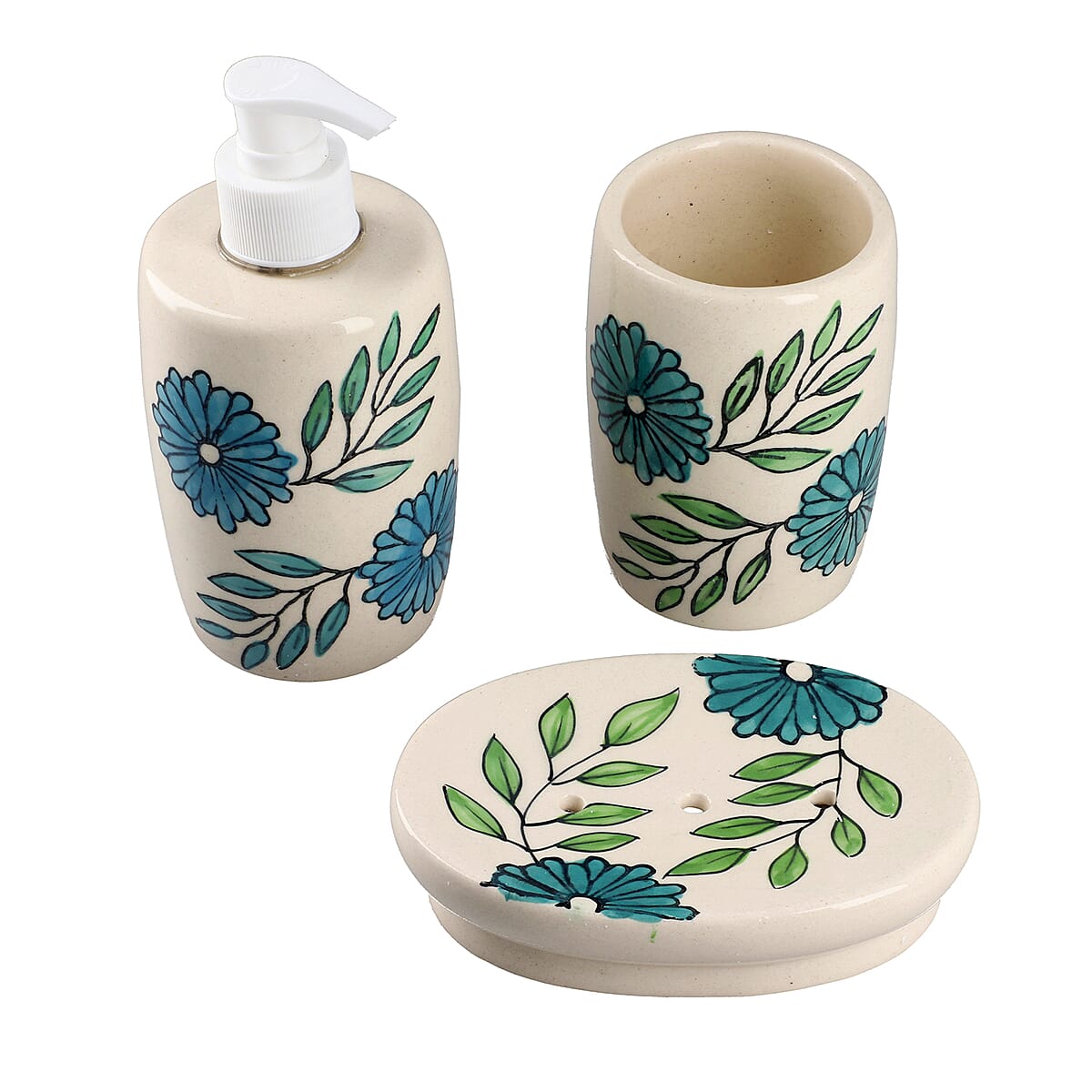 Upgrade your bathroom with our elegant set of 3 ceramic bathroom accessories – a complete bath accessory set with a liquid soap dispenser, soap tray, and tumbler. Hand-painted with an attractive pattern and water-resistant, these ceramic pieces add functionality and enhance your bathroom decor. Crafted from high-quality ceramic, this bathroom set is designed to last long and is easy to clean and maintain.