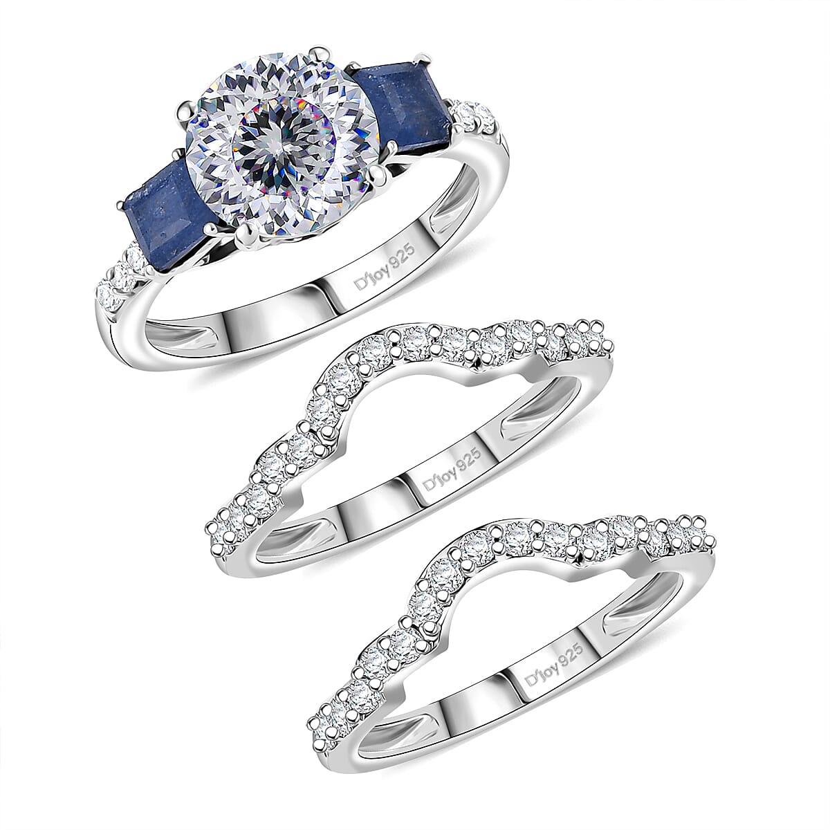 Set of 3 D'Joy 120 Facet Moissanite and Masoala Sapphire (D) 4.45 ctw Stackable Ring in Rhodium Over Sterling Silver (Size 6)