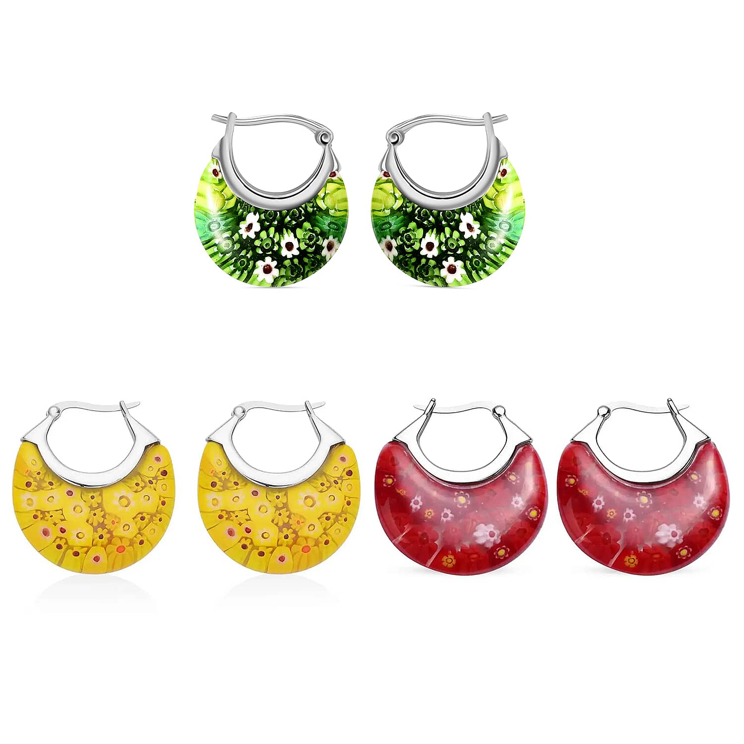 Set of 3 Green, Red and Yellow Murano Style Basket Earrings in Stainless Steel