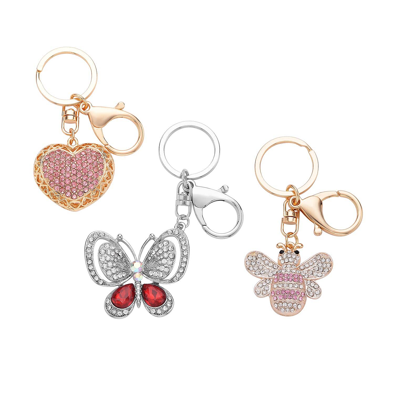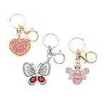 Set of 3 Multi Color Austrian Crystal, Red Glass, Enameled Heart, Butterfly and Bee Keychain in Dualtone, Cute Keychains, Key Holders, Key Rings, Cool Keychains