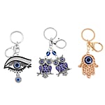 Set of 3 Murano Style, Resin, Blue and White Austrian Crystal Enameled Hamsa, Owl and Eye Keychain in Dualtone, Cute Keychains, Key Holders, Key Rings, Cool Keychains