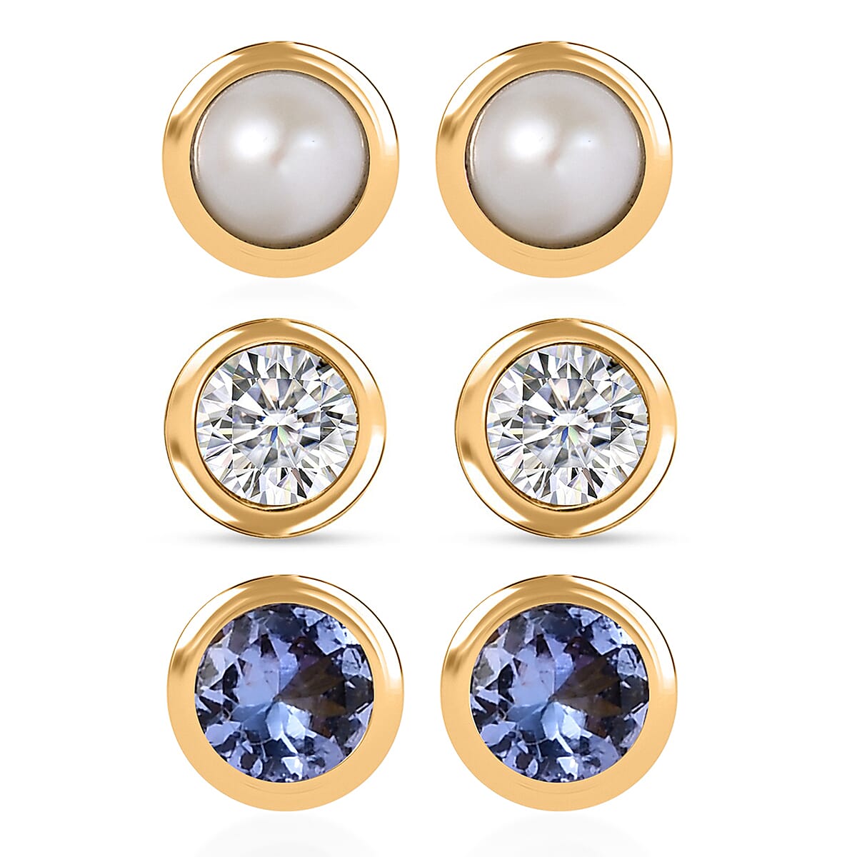 Set of 3 Poke Free Tanzanite, Freshwater Pearl, Luxuriant Lab Grown Diamond Stud Earrings in 18K Vermeil YG Over Sterling Silver 1.00 ctw